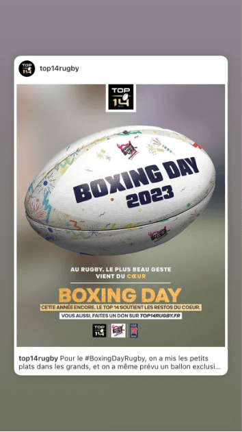 Pour la troisième année consécutive, la Ligue Nationale de Rugby (LNR) et les clubs du TOP 14 se mobilisent aux côtés des Restos du coeur à l’occasion du Boxing Day les 29, 30 et 31 décembre.